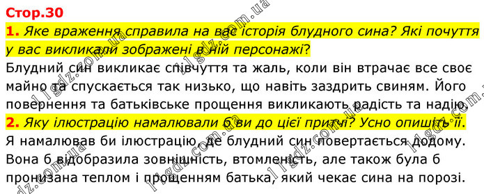 1. Яке враження справила на вас історія блудного сина? Які почуття у вас викликали зображені в ній персонажі? Блудний син викликає співчуття та жаль, коли він втрачає все своє майно та спускається так низько, що навіть заздрить свиням. Його повернення та батьківське прощення викликають радість та надію. 2. Яку ілюстрацію намалювали б ви до цієї притчі? Усно опишіть її. Я намалював би ілюстрацію, де блудний син повертається додому. Вона б відобразила зовнішність, втомленість, але також була б пронизана теплом і прощенням батька, який чекає сина на порозі.