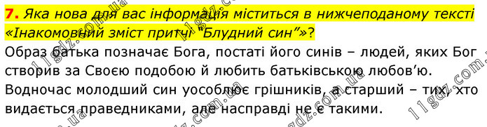 Яка нова для вас інформація міститься в нижчеподаному тексті «Інакомовний зміст притчі “Блудний син”»? Образ батька позначає Бога, постаті його синів – людей, яких Бог створив за Своєю подобою й любить батьківською любов’ю. Водночас молодший син уособлює грішників, а старший – тих, хто видається праведниками, але насправді не є такими.