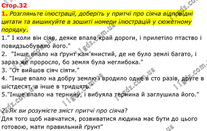 1. Розгляньте ілюстрації, доберіть у притчі про сіяча відповідні цитати та вишикуйте в зошиті номери ілюстрацій у сюжетному порядку. 1." І коли він сіяв, деяке впало край дороги, і прилетіло птаство і повидзьобувало його." 2. "Інше впало на ґрунт кам’янистий, де не було землі багато, і зараз же проросло, бо земля була неглибока." 3. "От вийшов сіяч сіяти." 4. "Інше впало на добру землю і вродило одне в сто разів, друге в шістдесят, а інше в тридцять." 5. "Інше впало на тернину, і вибуяла тернина й заглушила його." 2. Як ви розумієте зміст притчі про сіяча? Для того щоб навчатися, розвиватися людина має бути до цього готовою, мати правильний ґрунт"
