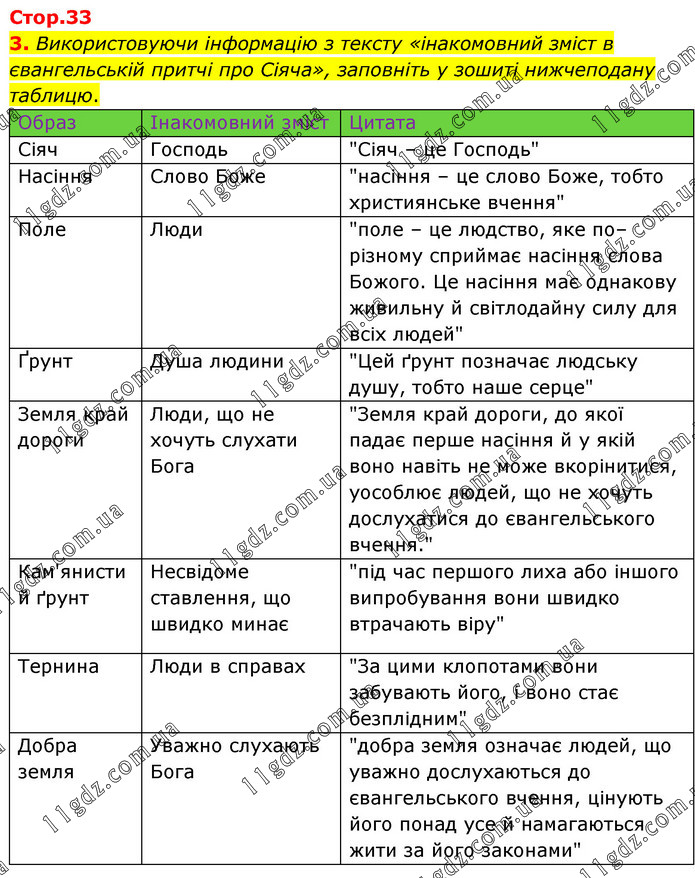 Використовуючи інформацію з тексту «інакомовний зміст в євангельській притчі про Сіяча», заповніть у зошиті нижчеподану таблицю. Образ Інакомовний зміст Цитата Сіяч Господь "Сіяч – це Господь" Насіння Слово Боже "насіння – це слово Боже, тобто християнське вчення" Поле Люди "поле – це людство, яке по–різному сприймає насіння слова Божого. Це насіння має однакову живильну й світлодайну силу для всіх людей" Ґрунт Душа людини "Цей ґрунт позначає людську душу, тобто наше серце" Земля край дороги Люди, що не хочуть слухати Бога "Земля край дороги, до якої падає перше насіння й у якій воно навіть не може вкорінитися, уособлює людей, що не хочуть дослухатися до євангельського вчення." Кам'янистий ґрунт Несвідоме ставлення, що швидко минає "під час першого лиха або іншого випробування вони швидко втрачають віру" Тернина Люди в справах "За цими клопотами вони забувають його, і воно стає безплідним" Добра земля Уважно слухають Бога "добра земля означає людей, що уважно дослухаються до євангельського вчення, цінують його понад усе й намагаються жити за його законами"