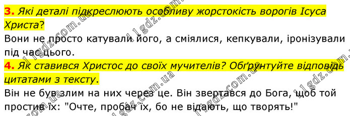 3. Які деталі підкреслюють особливу жорстокість ворогів Ісуса Христа? Вони не просто катували його, а сміялися, кепкували, іронізували під час цього. 4. Як ставився Христос до своїх мучителів? Обґрунтуйте відповідь цитатами з тексту. Він не був злим на них через це. Він звертався до Бога, щоб той простив їх: "Очте, пробач їх, бо не відають, що творять!"