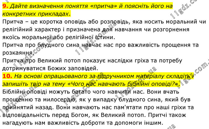 9. Дайте визначення поняття «притча» й поясніть його на конкретних прикладах. Притча – це коротка оповідь або розповідь, яка носить моральний чи релігійний характер і призначена для навчання чи розгорнення якоїсь моральної або релігійної істини. Притча про блудного сина навчає нас про важливість прощення та розкаяння. Притча про Великий потоп показує наслідки гріха та потребу дотримуватися Божих заповідей. 10. На основі опрацьованого за підручником матеріалу складіть і запишіть твір на тему «Чого нас навчають біблійні оповіді?». Біблійні оповіді можуть багато чого навчити нас. Вони вчать прощенню та милосердю, як у випадку блудного сина, який був прийнятий назад. Вони навчають нас пам'ятати про наші гріхи та відповідальність перед Богом, як Великий потоп. Притчі також нагадують нам важливість доброти та допомоги іншим.