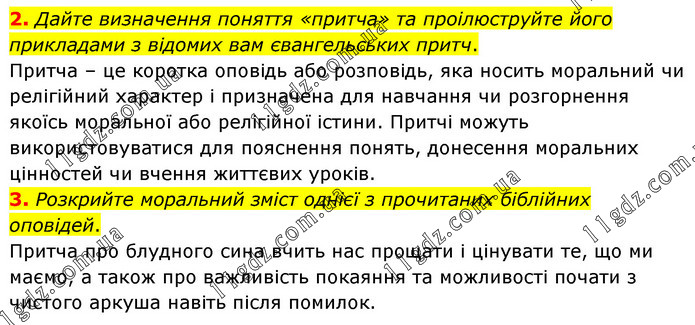 2. Дайте визначення поняття «притча» та проілюструйте його прикладами з відомих вам євангельських притч. Притча – це коротка оповідь або розповідь, яка носить моральний чи релігійний характер і призначена для навчання чи розгорнення якоїсь моральної або релігійної істини. Притчі можуть використовуватися для пояснення понять, донесення моральних цінностей чи вчення життєвих уроків. 3. Розкрийте моральний зміст однієї з прочитаних біблійних оповідей. Притча про блудного сина вчить нас прощати і цінувати те, що ми маємо, а також про важливість покаяння та можливості почати з чистого аркуша навіть після помилок.