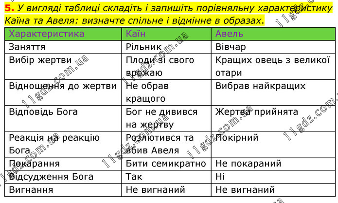 У вигляді таблиці складіть і запишіть порівняльну характеристику Каїна та Авеля: визначте спільне і відмінне в образах. Характеристика Каїн Авель Заняття Рільник Вівчар Вибір жертви Плоди зі свого врожаю Кращих овець з великої отари Відношення до жертви Не обрав кращого Вибрав найкращих Відповідь Бога Бог не дивився на жертву Жертва прийнята Реакція на реакцію Бога Розлютився та вбив Авеля Покірний Покарання Бити семикратно Не покараний Відсудження Бога Так Ні Вигнання Не вигнаний Не вигнаний