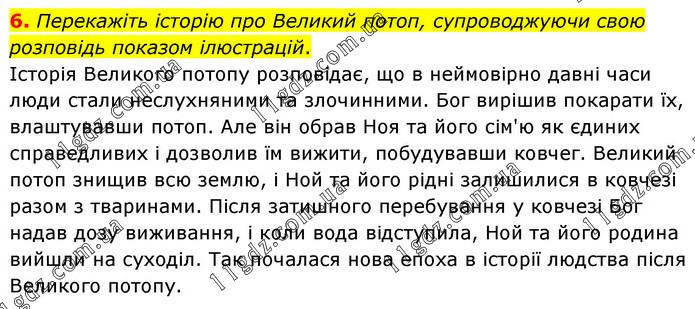 Перекажіть історію про Великий потоп, супроводжуючи свою розповідь показом ілюстрацій. Історія Великого потопу розповідає, що в неймовірно давні часи люди стали неслухняними та злочинними. Бог вирішив покарати їх, влаштувавши потоп. Але він обрав Ноя та його сім'ю як єдиних справедливих і дозволив їм вижити, побудувавши ковчег. Великий потоп знищив всю землю, і Ной та його рідні залишилися в ковчезі разом з тваринами. Після затишного перебування у ковчезі Бог надав дозу виживання, і коли вода відступила, Ной та його родина вийшли на суходіл. Так почалася нова епоха в історії людства після Великого потопу.