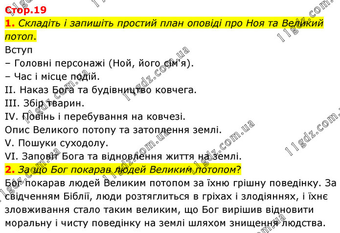 1. Складіть і запишіть простий план оповіді про Ноя та Великий потоп. Вступ – Головні персонажі (Ной, його сім'я). – Час і місце подій. II. Наказ Бога та будівництво ковчега. III. Збір тварин. IV. Повінь і перебування на ковчезі. Опис Великого потопу та затоплення землі. V. Пошуки суходолу. VI. Заповіт Бога та відновлення життя на землі. 2. За що Бог покарав людей Великим потопом? Бог покарав людей Великим потопом за їхню грішну поведінку. За свідченням Біблії, люди розтяглиться в гріхах і злодіяннях, і їхнє зловживання стало таким великим, що Бог вирішив відновити моральну і чисту поведінку на землі шляхом знищення людства.