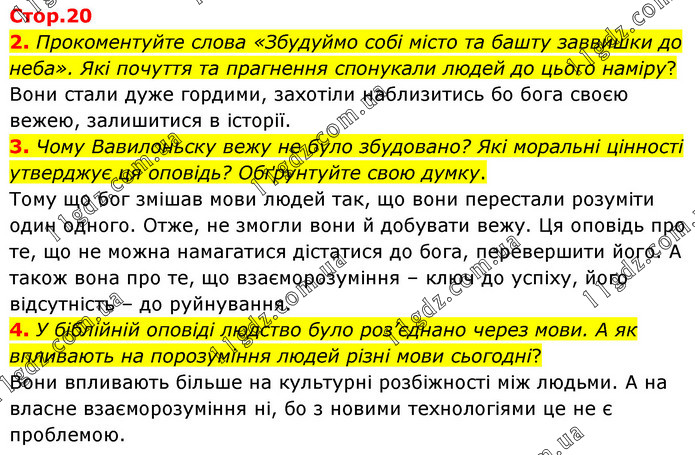 2. Прокоментуйте слова «Збудуймо собі місто та башту заввишки до неба». Які почуття та прагнення спонукали людей до цього наміру? Вони стали дуже гордими, захотіли наблизитись бо бога своєю вежею, залишитися в історії. 3. Чому Вавилоньску вежу не було збудовано? Які моральні цінності утверджує ця оповідь? Обґрунтуйте свою думку. Тому що бог змішав мови людей так, що вони перестали розуміти один одного. Отже, не змогли вони й добувати вежу. Ця оповідь про те, що не можна намагатися дістатися до бога, перевершити його. А також вона про те, що взаєморозуміння – ключ до успіху, його відсутність – до руйнування. 4. У біблійній оповіді людство було роз’єднано через мови. А як впливають на порозуміння людей різні мови сьогодні? Вони впливають більше на культурні розбіжності між людьми. А на власне взаєморозуміння ні, бо з новими технологіями це не є проблемою.