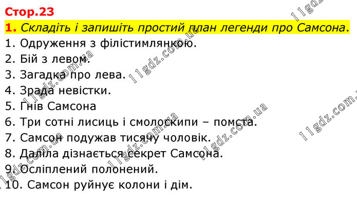 Складіть і запишіть простий план легенди про Самсона. 1. Одруження з філістимлянкою. 2. Бій з левом. 3. Загадка про лева. 4. Зрада невістки. 5. Гнів Самсона 6. Три сотні лисиць і смолоскипи – помста. 7. Самсон подужав тисячу чоловік. 8. Даліла дізнається секрет Самсона. 9. Осліплений полонений. 10. Самсон руйнує колони і дім.