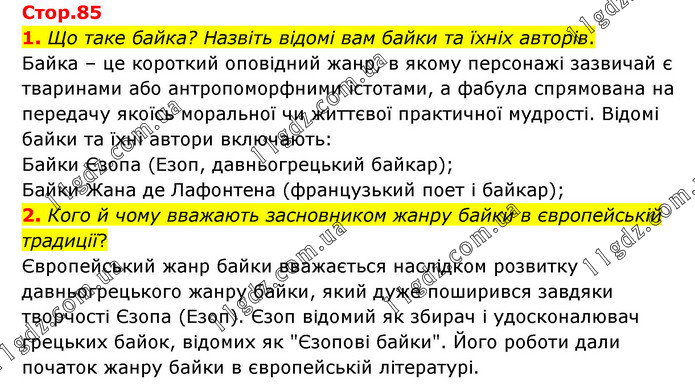 1. Що таке байка? Назвіть відомі вам байки та їхніх авторів. Байка – це короткий оповідний жанр, в якому персонажі зазвичай є тваринами або антропоморфними істотами, а фабула спрямована на передачу якоїсь моральної чи життєвої практичної мудрості. Відомі байки та їхні автори включають: Байки Єзопа (Езоп, давньогрецький байкар); Байки Жана де Лафонтена (французький поет і байкар); 2. Кого й чому вважають засновником жанру байки в європейській традиції? Європейський жанр байки вважається наслідком розвитку давньогрецького жанру байки, який дуже поширився завдяки творчості Єзопа (Езоп). Єзоп відомий як збирач і удосконалювач грецьких байок, відомих як "Єзопові байки". Його роботи дали початок жанру байки в європейській літературі.