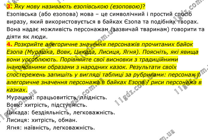 3. Яку мову називають езопівською (езоповою)? Езопівська (або езопова) мова – це символічний і простий спосіб виразу, який використовується в байках Єзопа та подібних творах. Вона надає можливість персонажам (зазвичай тваринам) говорити та діяти як люди. 4. Розкрийте алегоричне значення персонажів прочитаних байок Езопа (Мурашка, Вовк, Цикада, Лисиця, Ягня). Поясніть, які явища вони уособлюють. Порівняйте свої висновки з традиційними інакомовними образами з народних казок. Результати своїх спостережень запишіть у вигляді таблиці за рубриками: персонаж / алегоричне значення персонажа в байках Езопа / риси персонажа в казках. Мурашка: працьовитість, плідність. Вовк: хитрість, підступність. Цикада: бездіяльність, легковажність. Лисиця: хитрість, обман. Ягня: наївність, легковажність.