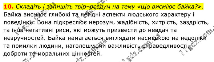 Складіть і запишіть твір–роздум на тему «Що висміює байка?». Байка висміює глибокі та негідні аспекти людського характеру і поведінки. Вона підкреслює нерозум, жадібність, хитрість, заздрість, та інші негативні риси, які можуть призвести до невдач та незручностей. Байка намагається виглядати насмішкою на недоліки та помилки людини, наголошуючи важливість справедливості, доброти та моральних цінностей.