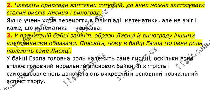 2. Наведіть приклади життєвих ситуацій, до яких можна застосувати сталий вислів Лисиця і виноград. Якщо учень хотів перемогти в Олімпіаді математики, але не зміг і каже, що математика – нецікава. 3. У прочитаній байці замініть образи Лисиці й винограду іншими алегоричними образами. Поясніть, чому в байці Езопа головна роль належить саме Лисиці. У байці Езопа головна роль належить саме лисиці, оскільки вона втілює головний моральний висновок байки. Її хитрість і самозадоволеність допомагають викреслити основний повчальний аспект твору.