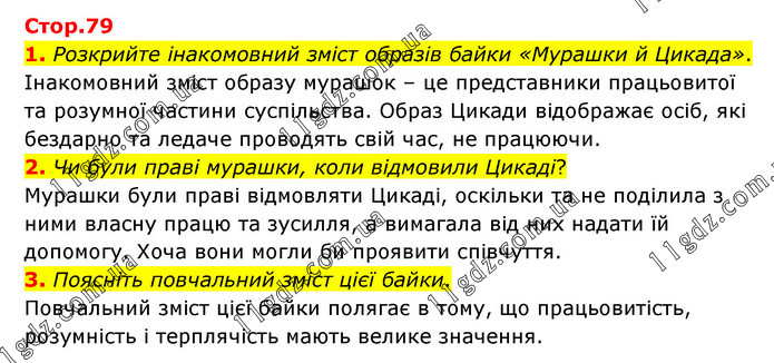 1. Розкрийте інакомовний зміст образів байки «Мурашки й Цикада». Інакомовний зміст образу мурашок – це представники працьовитої та розумної частини суспільства. Образ Цикади відображає осіб, які бездарно та ледаче проводять свій час, не працюючи. 2. Чи були праві мурашки, коли відмовили Цикаді? Мурашки були праві відмовляти Цикаді, оскільки та не поділила з ними власну працю та зусилля, а вимагала від них надати їй допомогу. Хоча вони могли би проявити співчуття. 3. Поясніть повчальний зміст цієї байки. Повчальний зміст цієї байки полягає в тому, що працьовитість, розумність і терплячість мають велике значення.
