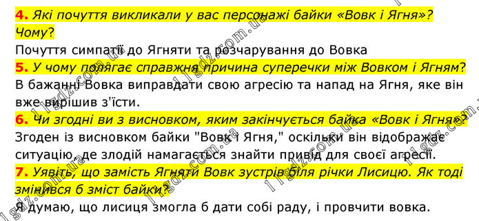 4. Які почуття викликали у вас персонажі байки «Вовк і Ягня»? Чому? Почуття симпатії до Ягняти та розчарування до Вовка 5. У чому полягає справжня причина суперечки між Вовком і Ягням? В бажанні Вовка виправдати свою агресію та напад на Ягня, яке він вже вирішив з'їсти. 6. Чи згодні ви з висновком, яким закінчується байка «Вовк і Ягня»? Згоден із висновком байки "Вовк і Ягня," оскільки він відображає ситуацію, де злодій намагається знайти привід для своєї агресії. 7. Уявіть, що замість Ягняти Вовк зустрів біля річки Лисицю. Як тоді змінився б зміст байки? Я думаю, що лисиця змогла б дати собі раду, і провчити вовка.