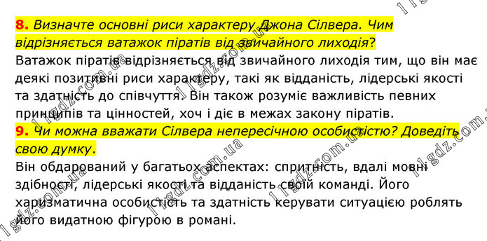 8. Визначте основні риси характеру Джона Сілвера. Чим відрізняється ватажок піратів від звичайного лиходія? Ватажок піратів відрізняється від звичайного лиходія тим, що він має деякі позитивні риси характеру, такі як відданість, лідерські якості та здатність до співчуття. Він також розуміє важливість певних принципів та цінностей, хоч і діє в межах закону піратів. 9. Чи можна вважати Сілвера непересічною особистістю? Доведіть свою думку. Він обдарований у багатьох аспектах: спритність, вдалі мовні здібності, лідерські якості та відданість своїй команді. Його харизматична особистість та здатність керувати ситуацією роблять його видатною фігурою в романі.