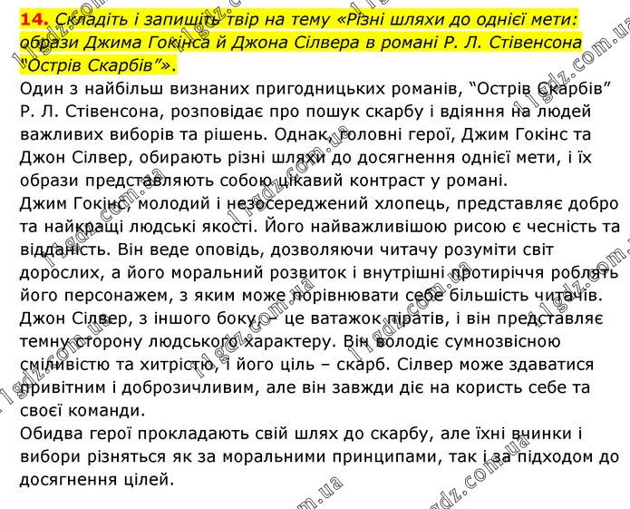 Складіть і запишіть твір на тему «Різні шляхи до однієї мети: образи Джима Гокінса й Джона Сілвера в романі Р. Л. Стівенсона “Острів Скарбів”». Один з найбільш визнаних пригодницьких романів, “Острів Скарбів” Р. Л. Стівенсона, розповідає про пошук скарбу і вдіяння на людей важливих виборів та рішень. Однак, головні герої, Джим Гокінс та Джон Сілвер, обирають різні шляхи до досягнення однієї мети, і їх образи представляють собою цікавий контраст у романі. Джим Гокінс, молодий і незосереджений хлопець, представляє добро та найкращі людські якості. Його найважливішою рисою є чесність та відданість. Він веде оповідь, дозволяючи читачу розуміти світ дорослих, а його моральний розвиток і внутрішні протиріччя роблять його персонажем, з яким може порівнювати себе більшість читачів. Джон Сілвер, з іншого боку, – це ватажок піратів, і він представляє темну сторону людського характеру. Він володіє сумнозвісною сміливістю та хитрістю, і його ціль – скарб. Сілвер може здаватися привітним і доброзичливим, але він завжди діє на користь себе та своєї команди. Обидва герої прокладають свій шлях до скарбу, але їхні вчинки і вибори різняться як за моральними принципами, так і за підходом до досягнення цілей.
