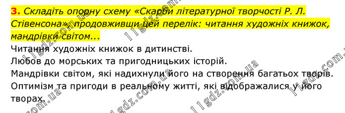Складіть опорну схему «Скарби літературної творчості Р. Л. Стівенсона», продовживши цей перелік: читання художніх книжок, мандрівки світом... Читання художніх книжок в дитинстві. Любов до морських та пригодницьких історій. Мандрівки світом, які надихнули його на створення багатьох творів. Оптимізм та пригоди в реальному житті, які відображалися у його творах.