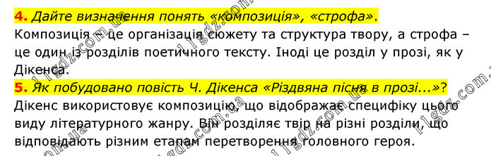 4. Дайте визначення понять «композиція», «строфа». Композиція – це організація сюжету та структура твору, а строфа – це один із розділів поетичного тексту. Іноді це розділ у прозі, як у Дікенса. 5. Як побудовано повість Ч. Дікенса «Різдвяна пісня в прозі...»? Дікенс використовує композицію, що відображає специфіку цього виду літературного жанру. Він розділяє твір на різні розділи, що відповідають різним етапам перетворення головного героя.