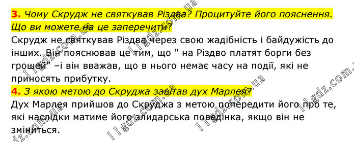 3. Чому Скрудж не святкував Різдва? Процитуйте його пояснення. Що ви можете на це заперечити? Скрудж не святкував Різдва через свою жадібність і байдужість до інших. Він пояснював це тим, що " на Різдво платят борги без грошей" –і він вважав, що в нього немає часу на події, які не приносять прибутку. 4. З якою метою до Скруджа завітав дух Марлея? Дух Марлея прийшов до Скруджа з метою попередити його про те, які наслідки матиме його злидарська поведінка, якщо він не зміниться.