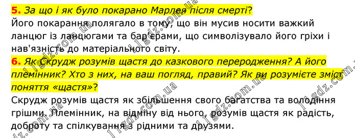 5. За що і як було покарано Марлея після смерті? Його покарання полягало в тому, що він мусив носити важкий ланцюг із ланцюгами та бар'єрами, що символізувало його гріхи і нав'язність до матеріального світу. 6. Як Скрудж розумів щастя до казкового переродження? А його племінник? Хто з них, на ваш погляд, правий? Як ви розумієте зміст поняття «щастя»? Скрудж розумів щастя як збільшення свого багатства та володіння грішми. Племінник, на відміну від нього, розумів щастя як радість, доброту та спілкування з рідними та друзями.