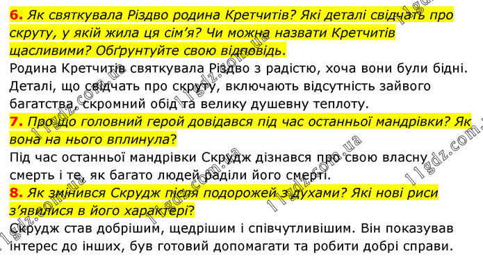 6. Як святкувала Різдво родина Кретчитів? Які деталі свідчать про скруту, у якій жила ця сім’я? Чи можна назвати Кретчитів щасливими? Обґрунтуйте свою відповідь. Родина Кретчитів святкувала Різдво з радістю, хоча вони були бідні. Деталі, що свідчать про скруту, включають відсутність зайвого багатства, скромний обід та велику душевну теплоту. 7. Про що головний герой довідався під час останньої мандрівки? Як вона на нього вплинула? Під час останньої мандрівки Скрудж дізнався про свою власну смерть і те, як багато людей раділи його смерті. 8. Як змінився Скрудж після подорожей з духами? Які нові риси з’явилися в його характері? Скрудж став добрішим, щедрішим і співчутливішим. Він показував інтерес до інших, був готовий допомагати та робити добрі справи.