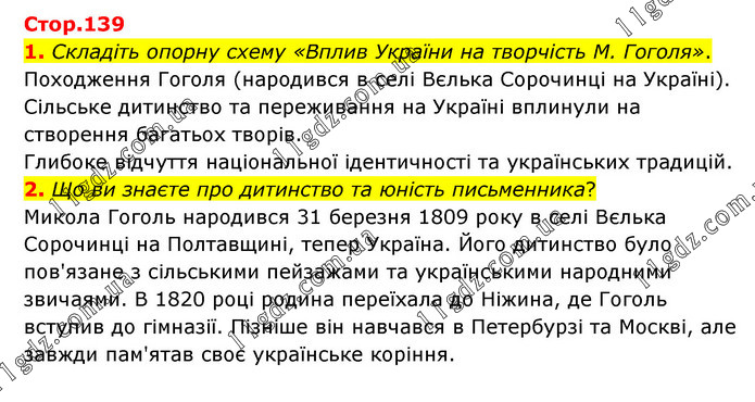 1. Складіть опорну схему «Вплив України на творчість М. Гоголя». Походження Гоголя (народився в селі Вєлька Сорочинці на Україні). Сільське дитинство та переживання на Україні вплинули на створення багатьох творів. Глибоке відчуття національної ідентичності та українських традицій. 2. Що ви знаєте про дитинство та юність письменника? Микола Гоголь народився 31 березня 1809 року в селі Вєлька Сорочинці на Полтавщині, тепер Україна. Його дитинство було пов'язане з сільськими пейзажами та українськими народними звичаями. В 1820 році родина переїхала до Ніжина, де Гоголь вступив до гімназії. Пізніше він навчався в Петербурзі та Москві, але завжди пам'ятав своє українське коріння.