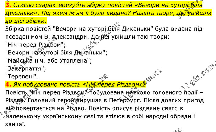 3. Стисло схарактеризуйте збірку повістей «Вечори на хуторі біля Диканьки». Під яким ім’ям її було видано? Назвіть твори, що увійшли до цієї збірки. Збірка повістей "Вечори на хуторі біля Диканьки" була видана під псевдонімом В. Александри. До неї увійшли такі твори: "Ніч перед Різдвом"; "Вечори на хуторі біля Диканьки"; "Майська ніч, або Утоплена"; "Закарпаття"; "Теревені". 4. Як побудовано повість «Ніч перед Різдвом»? Повість "Ніч перед Різдвом" побудована навколо головного події – Різдва. Головний герой вирушає в Петербург. Після довгих пригод він повертається на Різдво. Повість описує різдвяне свято в маленькому українському селі та втілює в собі народні обряди і звичаї.