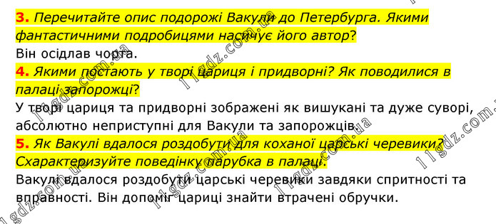 3. Перечитайте опис подорожі Вакули до Петербурга. Якими фантастичними подробицями насичує його автор? Він осідлав чорта. 4. Якими постають у творі цариця і придворні? Як поводилися в палаці запорожці? У творі цариця та придворні зображені як вишукані та дуже суворі, абсолютно неприступні для Вакули та запорожців. 5. Як Вакулі вдалося роздобути для коханої царські черевики? Схарактеризуйте поведінку парубка в палаці. Вакулі вдалося роздобути царські черевики завдяки спритності та вправності. Він допоміг цариці знайти втрачені обручки.