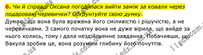 Чи й справді Оксана погодилася вийти заміж за коваля через подаровані черевички? Обґрунтуйте свою думку. Думаю, що вона була вражена його сміливістю і рішучістю, а не черевичками. З самого початку вона не дуже вірила, що вийде за нього колись, тому і дала нездійсненне завдання. Побачивши, що Вакула зробив це, вона розуміли глибину його почуттів.