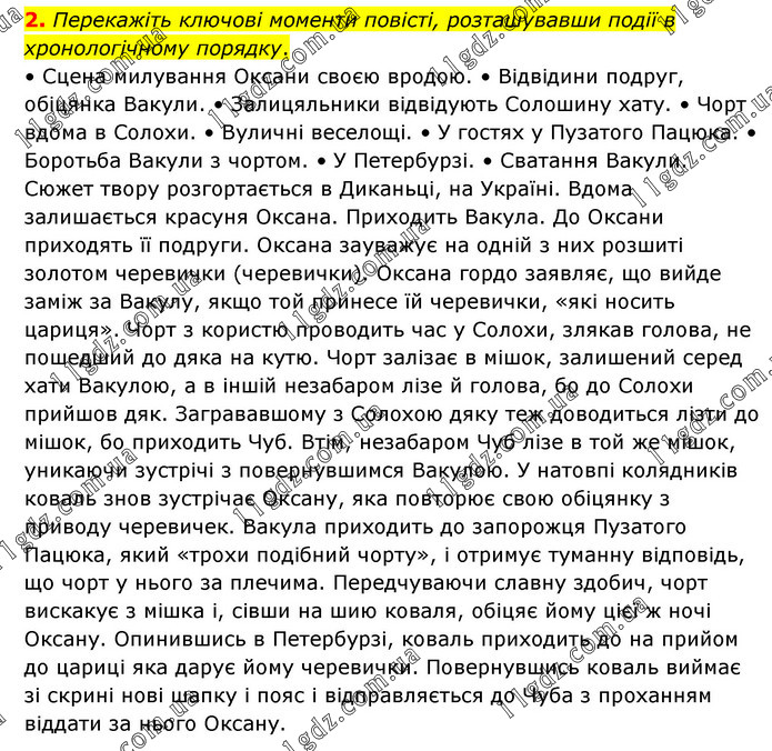 Перекажіть ключові моменти повісті, розташувавши події в хронологічному порядку. • Сцена милування Оксани своєю вродою. • Відвідини подруг, обіцянка Вакули. • Залицяльники відвідують Солошину хату. • Чорт вдома в Солохи. • Вуличні веселощі. • У гостях у Пузатого Пацюка. • Боротьба Вакули з чортом. • У Петербурзі. • Сватання Вакули. Сюжет твору розгортається в Диканьці, на Україні. Вдома залишається красуня Оксана. Приходить Вакула. До Оксани приходять її подруги. Оксана зауважує на одній з них розшиті золотом черевички (черевички). Оксана гордо заявляє, що вийде заміж за Вакулу, якщо той принесе їй черевички, «які носить цариця». Чорт з користю проводить час у Солохи, злякав голова, не пошедший до дяка на кутю. Чорт залізає в мішок, залишений серед хати Вакулою, а в іншій незабаром лізе й голова, бо до Солохи прийшов дяк. Загрававшому з Солохою дяку теж доводиться лізти до мішок, бо приходить Чуб. Втім, незабаром Чуб лізе в той же мішок, уникаючи зустрічі з повернувшимся Вакулою. У натовпі колядників коваль знов зустрічає Оксану, яка повторює свою обіцянку з приводу черевичек. Вакула приходить до запорожця Пузатого Пацюка, який «трохи подібний чорту», і отримує туманну відповідь, що чорт у нього за плечима. Передчуваючи славну здобич, чорт вискакує з мішка і, сівши на шию коваля, обіцяє йому цієї ж ночі Оксану. Опинившись в Петербурзі, коваль приходить до на прийом до цариці яка дарує йому черевички. Повернувшись коваль виймає зі скрині нові шапку і пояс і відправляється до Чуба з проханням віддати за нього Оксану.