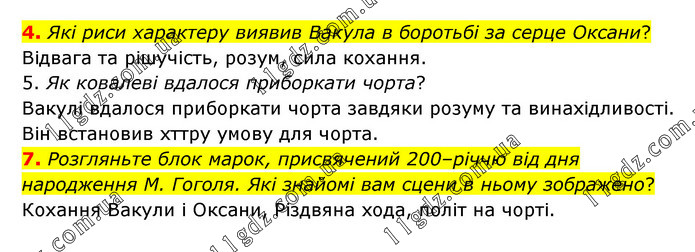 4. Які риси характеру виявив Вакула в боротьбі за серце Оксани? Відвага та рішучість, розум, сила кохання. 5. Як ковалеві вдалося приборкати чорта? Вакулі вдалося приборкати чорта завдяки розуму та винахідливості. Він встановив хттру умову для чорта. 7. Розгляньте блок марок, присвячений 200–річчю від дня народження М. Гоголя. Які знайомі вам сцени в ньому зображено? Кохання Вакули і Оксани, Різдвяна хода, політ на чорті.