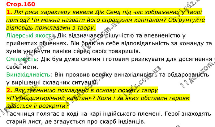1. Які риси характеру виявив Дік Сенд під час зображених у творі пригод? Чи можна назвати його справжнім капітаном? Обґрунтуйте відповідь прикладами з твору. Лідерські якості: Дік відзначався рішучістю та впевненістю у прийнятих рішеннях. Він брав на себе відповідальність за команду та зумів уникнути паніки серед своїх товаришів. Сміливість: Дік був дуже смілим і готовим ризикувати для досягнення своєї мети. Винахідливість: Він проявив велику винахідливість та обдарованість у вирішенні складних ситуацій. 2. Яку таємницю покладено в основу сюжету твору «П’ятнадцятирічний капітан»? Коли і за яких обставин героям вдається її розкрити? Таємниця полягає в коді на карі індійського племені. Герої знаходять старий лист, де згадується про скарб індіанців.