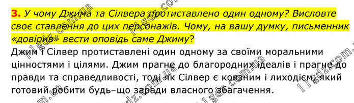 У чому Джима та Сілвера протиставлено один одному? Висловте своє ставлення до цих персонажів. Чому, на вашу думку, письменник «довірив» вести оповідь саме Джиму? Джим і Сілвер протиставлені один одному за своїми моральними цінностями і цілями. Джим прагне до благородних ідеалів і прагне до правди та справедливості, тоді як Сілвер є ковзним і лиходієм, який готовий робити будь–що заради власного збагачення.