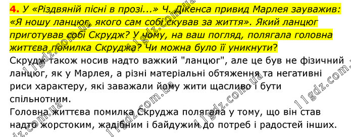У «Різдвяній пісні в прозі...» Ч. Дікенса привид Марлея зауважив: «Я ношу ланцюг, якого сам собі скував за життя». Який ланцюг приготував собі Скрудж? У чому, на ваш погляд, полягала головна життєва помилка Скруджа? Чи можна було її уникнути? Скрудж також носив надто важкий "ланцюг", але це був не фізичний ланцюг, як у Марлея, а різні матеріальні обтяження та негативні риси характеру, які заважали йому жити щасливо і бути спільнотним. Головна життєва помилка Скруджа полягала у тому, що він став надто жорстоким, жадібним і байдужим до потреб і радостей інших.