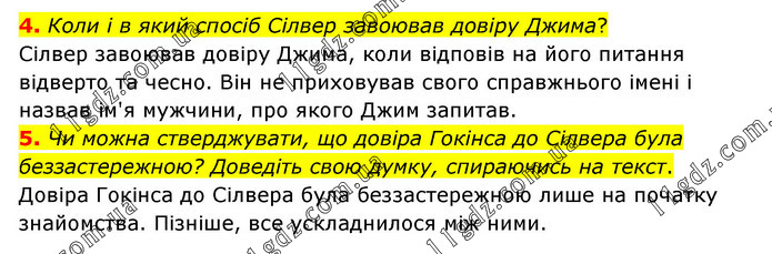 4. Коли і в який спосіб Сілвер завоював довіру Джима? Сілвер завоював довіру Джима, коли відповів на його питання відверто та чесно. Він не приховував свого справжнього імені і назвав ім'я мужчини, про якого Джим запитав. 5. Чи можна стверджувати, що довіра Гокінса до Сілвера була беззастережною? Доведіть свою думку, спираючись на текст. Довіра Гокінса до Сілвера була беззастережною лише на початку знайомства. Пізніше, все ускладнилося між ними.