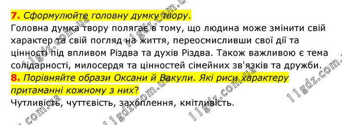 7. Сформулюйте головну думку твору. Головна думка твору полягає в тому, що людина може змінити свій характер та свій погляд на життя, переосмисливши свої дії та цінності під впливом Різдва та духів Різдва. Також важливою є тема солідарності, милосердя та цінностей сімейних зв'язків та дружби. 8. Порівняйте образи Оксани й Вакули. Які риси характеру притаманні кожному з них? Чутливість, чуттєвість, захоплення, кмітливість.