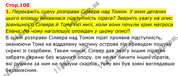 Перекажіть сцену розправи Сілвера над Томом. У яких деталях цього епізоду виявилася підступність пірата? Зверніть увагу на опис зовнішності Сілвера й Тома тієї миті, коли вони почули крик матроса Елена. На чому наголошує оповідач у цьому описі? В сцені розправи Сілвера над Томом пірат проявив підступність, зманюючи Тома на віддалену частину острова під приводом пошуку скрині зі скарбами. Таким чином, Сілвер дав змогу іншим піратам забрати скриню без жодного опору. ом не міг бачити інших піратів, які рушили за ним на пошуки скарбів, тому він був зовні виглядавши беззахисним.