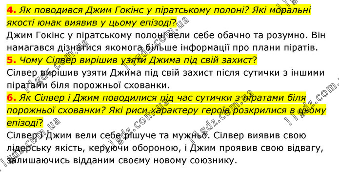 4. Як поводився Джим Гокінс у піратському полоні? Які моральні якості юнак виявив у цьому епізоді? Джим Гокінс у піратському полоні вели себе обачно та розумно. Він намагався дізнатися якомога більше інформації про плани піратів. 5. Чому Сілвер вирішив узяти Джима під свій захист? Сілвер вирішив узяти Джима під свій захист після сутички з іншими піратами біля порожньої схованки. 6. Як Сілвер і Джим поводилися під час сутички з піратами біля порожньої схованки? Які риси характеру героїв розкрилися в цьому епізоді? Сілвер і Джим вели себе рішуче та мужньо. Сілвер виявив свою лідерську якість, керуючи обороною, і Джим проявив свою відвагу, залишаючись відданим своєму новому союзнику.