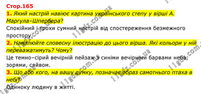 1. Який настрій навіює картина українського степу у вірші А. Маргула–Шпербера? Спокійний і трохи сумний настрій від спостереження безмежного простору. 2. Намалюйте словесну ілюстрацію до цього вірша. Які кольори у ній переважатимуть? Чому? Це темно–сірий вечірній пейзаж з синіми вечірніми барвами неба, зорями, сяйвом. 3. Що або кого, на вашу думку, позначає образ самотнього птаха в небі? Одиноку людину в житті.