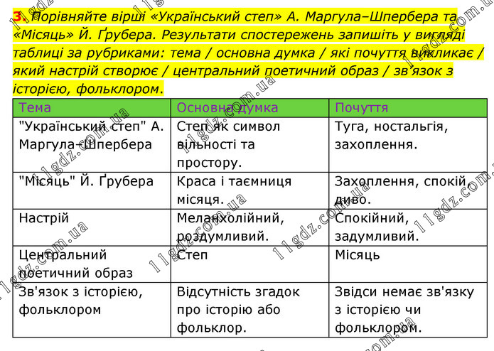 Порівняйте вірші «Український степ» А. Маргула–Шпербера та «Місяць» Й. Ґрубера. Результати спостережень запишіть у вигляді таблиці за рубриками: тема / основна думка / які почуття викликає / який настрій створює / центральний поетичний образ / зв’язок з історією, фольклором. Тема Основна думка Почуття "Український степ" А. Маргула–Шпербера Степ як символ вільності та простору. Туга, ностальгія, захоплення. "Місяць" Й. Ґрубера Краса і таємниця місяця. Захоплення, спокій, диво. Настрій Меланхолійний, роздумливий. Спокійний, задумливий. Центральний поетичний образ Степ Місяць Зв'язок з історією, фольклором Відсутність згадок про історію або фольклор. Звідси немає зв'язку з історією чи фольклором.
