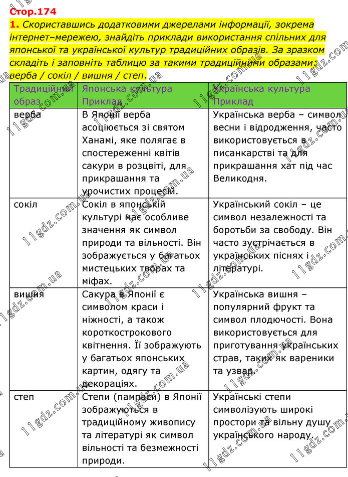 Скориставшись додатковими джерелами інформації, зокрема інтернет–мережею, знайдіть приклади використання спільних для японської та української культур традиційних образів. За зразком складіть і заповніть таблицю за такими традиційними образами: верба / сокіл / вишня / степ. Традиційний образ Японська культура Приклад Українська культура Приклад верба В Японії верба асоціюється зі святом Ханамі, яке полягає в спостереженні квітів сакури в розцвіті, для прикрашання та урочистих процесій. Українська верба – символ весни і відродження, часто використовується в писанкарстві та для прикрашання хат під час Великодня. сокіл Сокіл в японській культурі має особливе значення як символ природи та вільності. Він зображується у багатьох мистецьких творах та міфах. Український сокіл – це символ незалежності та боротьби за свободу. Він часто зустрічається в українських піснях і літературі. вишня Сакура в Японії є символом краси і ніжності, а також короткострокового квітнення. Її зображують у багатьох японських картин, одягу та декораціях. Українська вишня – популярний фрукт та символ плодючості. Вона використовується для приготування українських страв, таких як вареники та узвар. степ Степи (пампаси) в Японії зображуються в традиційному живопису та літературі як символ вільності та безмежності природи. Українські степи символізують широкі простори та вільну душу українського народу.
