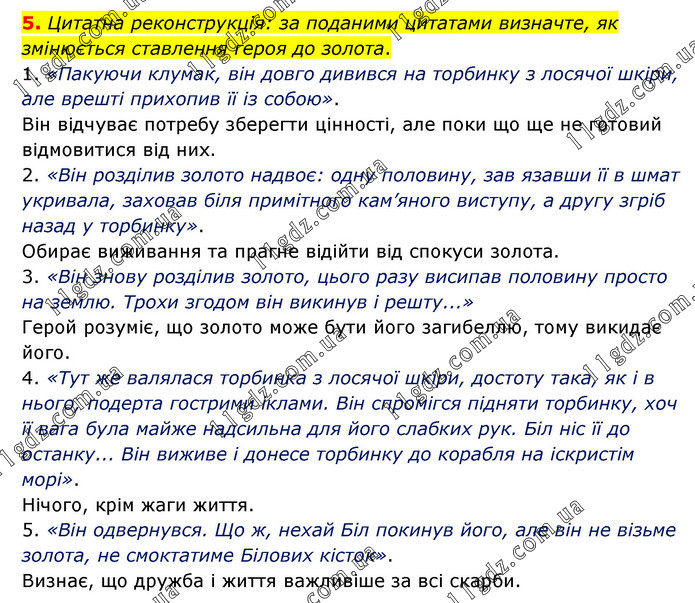 Цитатна реконструкція: за поданими цитатами визначте, як змінюється ставлення героя до золота. 1. «Пакуючи клумак, він довго дивився на торбинку з лосячої шкіри, але врешті прихопив її із собою». Він відчуває потребу зберегти цінності, але поки що ще не готовий відмовитися від них. 2. «Він розділив золото надвоє: одну половину, зав язавши її в шмат укривала, заховав біля примітного кам’яного виступу, а другу згріб назад у торбинку». Обирає виживання та прагне відійти від спокуси золота. 3. «Він знову розділив золото, цього разу висипав половину просто на землю. Трохи згодом він викинув і решту...» Герой розуміє, що золото може бути його загибеллю, тому викидає його. 4. «Тут же валялася торбинка з лосячої шкіри, достоту така, як і в нього, подерта гострими іклами. Він спромігся підняти торбинку, хоч її вага була майже надсильна для його слабких рук. Біл ніс її до останку... Він виживе і донесе торбинку до корабля на іскристім морі». Нічого, крім жаги життя. 5. «Він одвернувся. Що ж, нехай Біл покинув його, але він не візьме золота, не смоктатиме Білових кісток». Визнає, що дружба і життя важливіше за всі скарби.