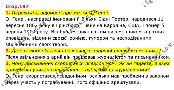 1. Перекажіть відомості про життя О. Генрі. О. Генрі, насправді іменований Вільям Сідні Портер, народився 11 вересня 1862 року в Грінсборо, Північна Кароліна, США, і помер 5 червня 1910 року. Він був американським письменником коротких оповідань, відомим своєю іронією, гумором та несподіваними закінченнями своїх творів. 2. Де і за яких обставин розпочався творчий шлях письменника? Після звільнення з армії він працював журналістом та письменником. 3. Чому письменник скористався псевдонімом? Як ви гадаєте, з яких причин він уникав спілкування з публікою та журналістами? О. Генрі скористався псевдонімом, оскільки мав проблеми з законом через участь у пограбуванні. Його офіційно арештували.