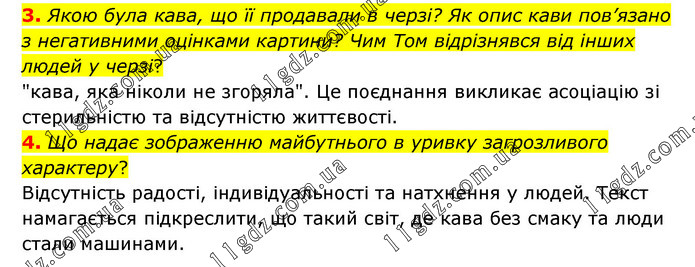 3. Якою була кава, що її продавали в черзі? Як опис кави пов’язано з негативними оцінками картини? Чим Том відрізнявся від інших людей у черзі? "кава, яка ніколи не згоряла". Це поєднання викликає асоціацію зі стерильністю та відсутністю життєвості. 4. Що надає зображенню майбутнього в уривку загрозливого характеру? Відсутність радості, індивідуальності та натхнення у людей. Текст намагається підкреслити, що такий світ, де кава без смаку та люди стали машинами.
