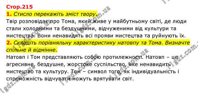 1. Стисло перекажіть зміст твору. Твір розповідає про Тома, який живе у майбутньому світі, де люди стали холодними та бездушними, відчуженими від культури та мистецтва. Вони ненавидять всі прояви мистецтва та руйнують їх. 2. Складіть порівняльну характеристику натовпу та Тома. Визначте спільне й відмінне. Натовп і Том представляють собою протилежності. Натовп – це агресивне, бездушне, жорстоке суспільство, яке ненавидить мистецтво та культуру. Том – символ того, як індивідуальність і спроможність відчувати можуть врятувати світ.