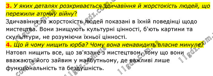 3. У яких деталях розкривається здичавіння й жорстокість людей, що пережили атомну війну? Здичавіння та жорстокість людей показані в їхній поведінці щодо мистецтва. Вони знищують культурні цінності, б'ють картини та скульптури, не розуміючи їхньої цінності. 4. Що й чому нищить юрба? Чому вона ненавидить власне минуле? Натовп нищить все, що зв'язане з мистецтвом, тому що вони вважають його зайвим у майбутньому, де важливі лише функціональність та бездушність.