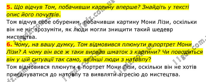 5. Що відчув Том, побачивши картину вперше? Знайдіть у тексті опис його почуттів. Том відчув себе обуреним, побачивши картину Мони Лізи, оскільки він не міг зрозуміти, як люди могли знищити такий шедевр мистецтва. 6. Чому, на вашу думку, Том відмовився плюнути в портрет Мони Лізи? А чому він все ж таки вирвав шматок з картини? Чи поводиться він у цій ситуації так само, як інші люди з натовпу? Том відмовився плюнути в портрет Мони Лізи, оскільки він не хотів приєднуватися до натовпу та виявляти агресію до мистецтва.