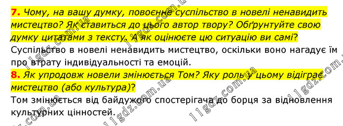 7. Чому, на вашу думку, повоєнне суспільство в новелі ненавидить мистецтво? Як ставиться до цього автор твору? Обґрунтуйте свою думку цитатами з тексту. А як оцінюєте цю ситуацію ви самі? Суспільство в новелі ненавидить мистецтво, оскільки воно нагадує їм про втрату індивідуальності та емоцій. 8. Як упродовж новели змінюється Том? Яку роль у цьому відіграє мистецтво (або культура)? Том змінюється від байдужого спостерігача до борця за відновлення культурних цінностей.