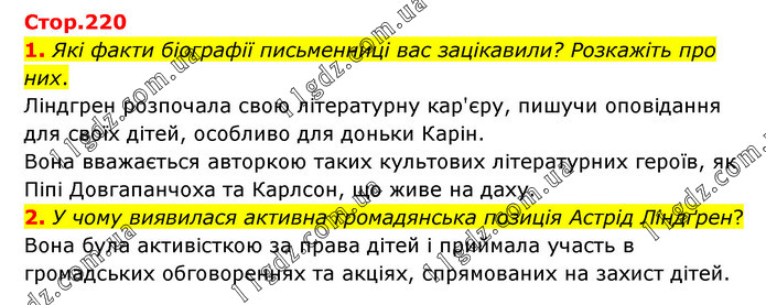 1. Які факти біографії письменниці вас зацікавили? Розкажіть про них. Ліндгрен розпочала свою літературну кар'єру, пишучи оповідання для своїх дітей, особливо для доньки Карін. Вона вважається авторкою таких культових літературних героїв, як Піпі Довгапанчоха та Карлсон, що живе на даху. 2. У чому виявилася активна громадянська позиція Астрід Ліндґрен? Вона була активісткою за права дітей і приймала участь в громадських обговореннях та акціях, спрямованих на захист дітей.