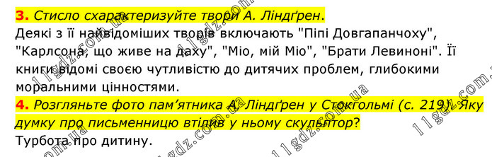 3. Стисло схарактеризуйте твори А. Ліндґрен. Деякі з її найвідоміших творів включають "Піпі Довгапанчоху", "Карлсона, що живе на даху", "Міо, мій Міо", "Брати Левиноні". Її книги відомі своєю чутливістю до дитячих проблем, глибокими моральними цінностями. 4. Розгляньте фото пам’ятника А. Ліндґрен у Стокгольмі (с. 219). Яку думку про письменницю втілив у ньому скульптор? Турбота про дитину.